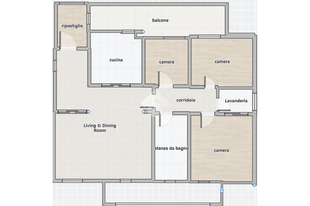 Due balconi servono l’intera abitazione, garantendo luminosità e continuità tra gli ambienti.